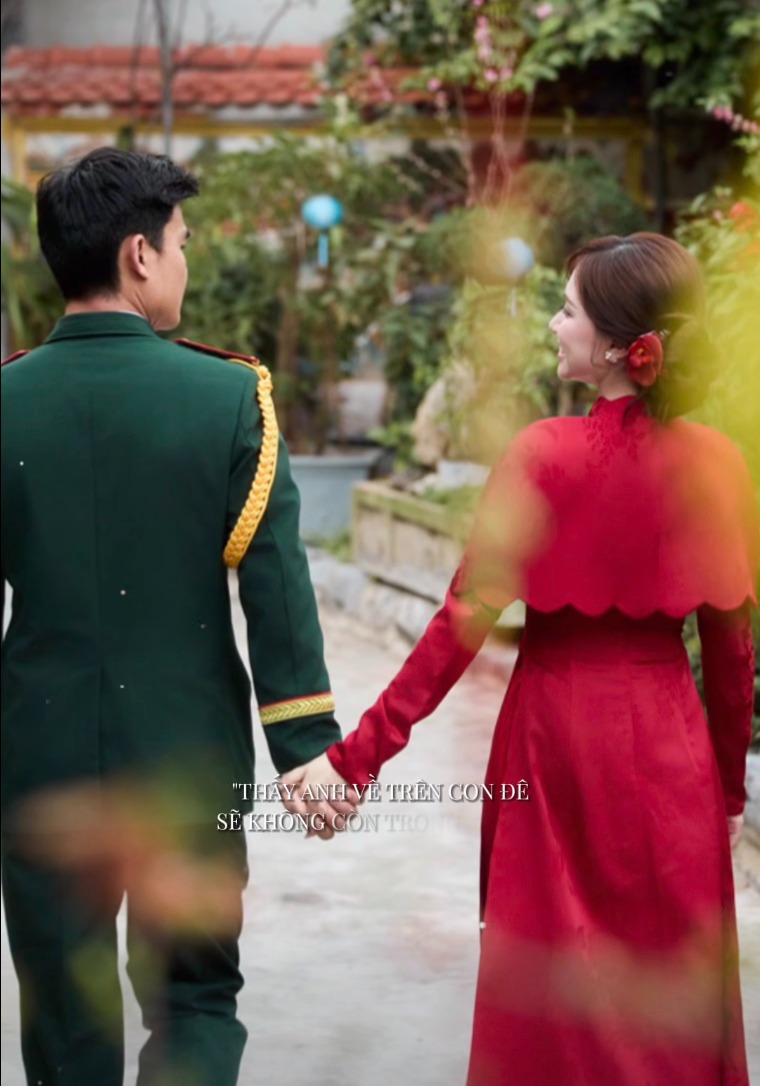 Trong loạt ảnh được chia sẻ, Hòa Minzy diện áo dài đỏ nổi bật, đứng cạnh một người đàn ông mặc quân phục. Cả hai nắm tay và có những cử chỉ gần gũi, tình cảm. Ở một khoảnh khắc khác, nữ ca sĩ tựa đầu vào vai đối phương và nở nụ cười rạng rỡ trước ống kính. Dù gương mặt nam chính không lộ rõ, nhưng bầu không khí lãng mạn trong khung hình khiến nhiều người không khỏi chú ý.