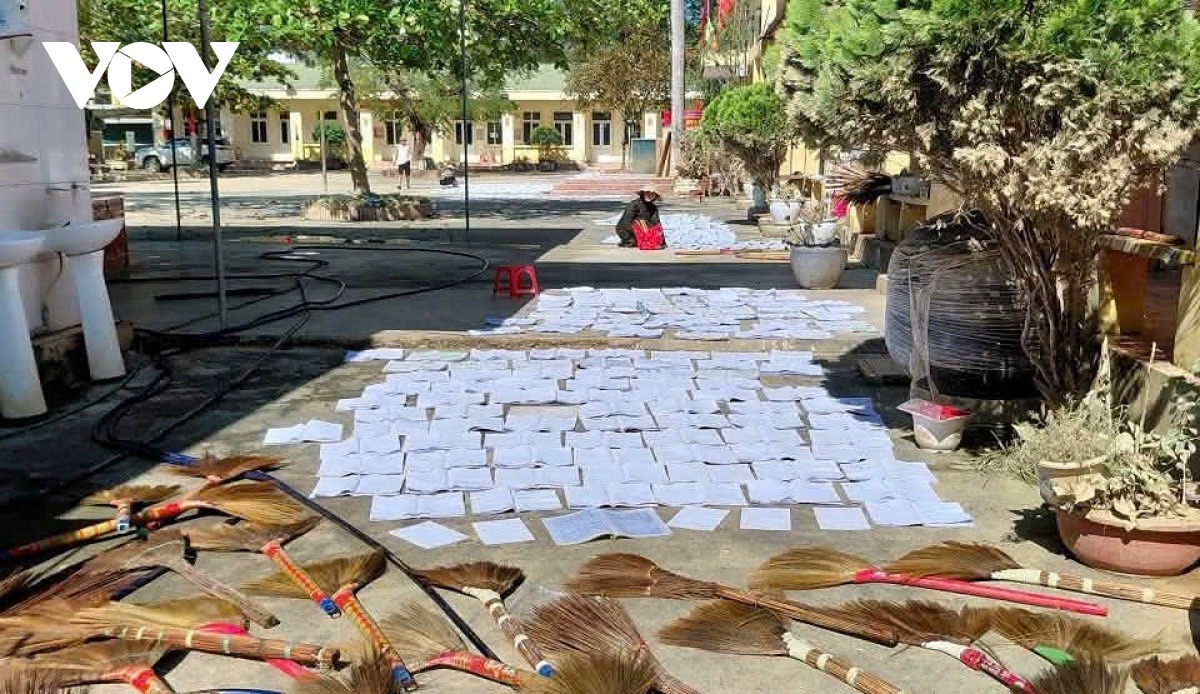 Hong phơi sách vở bị ướt tại một trường học xã Thành BÌnh Thọ, Nghệ An.