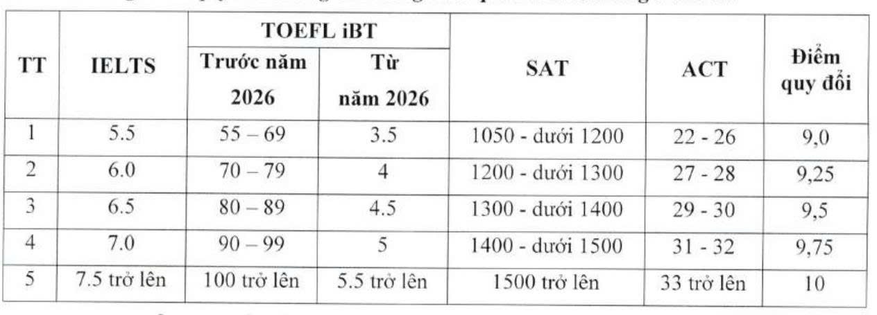 Hoặc thí sinh có chứng chỉ IELTS đạt từ 5.5 điểm, hoặc TOEFL iBT (trước năm 2026) đạt từ 55 điểm, hoặc TOEFL iBT (từ năm 2026) đạt từ 3.5 điểm, hoặc SAT từ 1.050 điểm, hoặc ACT từ 22 điểm.