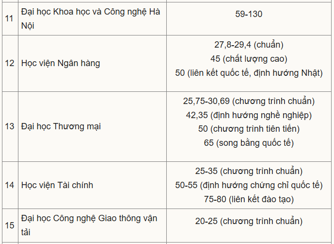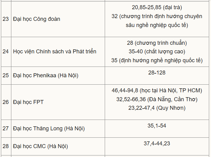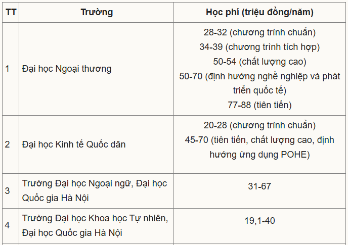 Học phí cao thường ở khối ngành Y Dược hoặc với các chương trình liên kết quốc tế, định hướng nghề nghiệp, chất lượng cao. Với chương trình chuẩn, các trường thu chủ yếu trong khoảng 20-40 triệu đồng.