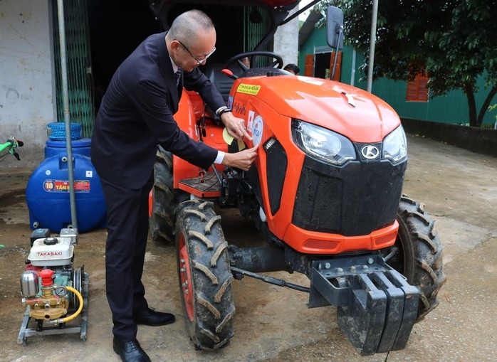 Ông Kobayashi, trưởng đại diện JICA Việt Nam, và máy cày - một trong những thiết bị đã được trao tặng cho xã Na Ngoi, tỉnh Nghệ An |