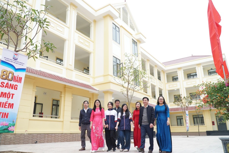 Giáo viên, học sinh Trường THPT Nguyễn Xuân Ôn trước dãy phòng học mới. Ảnh: Hồ Lài. |