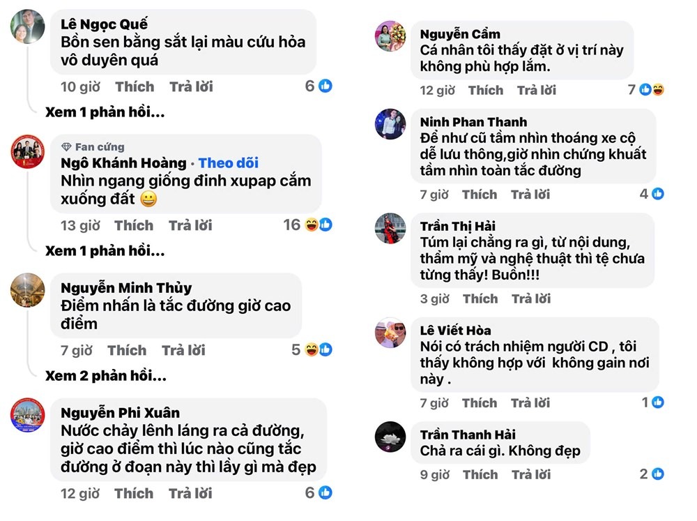 “Tóm lại chẳng ra gì, từ nội dung, thẩm mỹ đến nghệ thuật”, một bình luận thể hiện sự thất vọng, trong khi nhiều ý kiến khác cho rằng việc bố trí công trình tại vòng xuyến là chưa hợp lý về công năng.