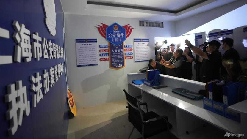 Giới truyền thông Thái Lan xem một căn phòng mô phỏng đồn cảnh sát Trung Quốc tại một trung tâm lừa đảo ở O'Smach - Campuchia. Ảnh: AP |
