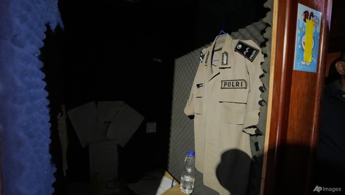Một chiếc áo giả cảnh sát Indonesia được treo bên trong một trung tâm lừa đảo ở O'Smach - Campuchia. Ảnh: AP |