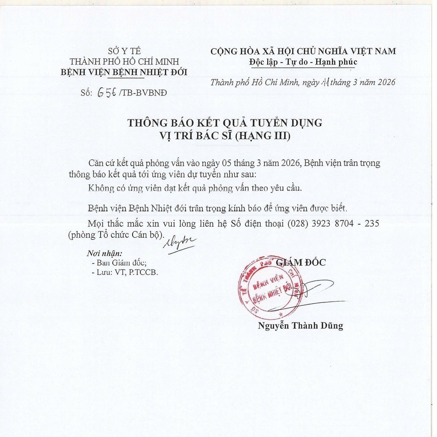 Đợt tuyển dụng bác sĩ hạng III tại Bệnh viện Nhiệt đới năm 2026 có 2 ứng viên và không ai trúng tuyển.