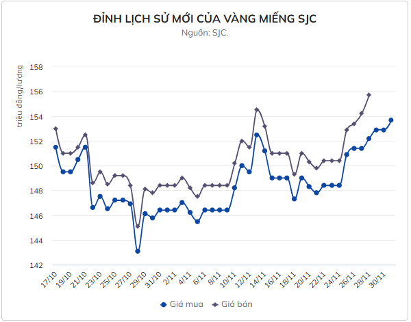 Với cú bứt tốc này, vàng miếng SJC đã chính thức xác lập đỉnh lịch sử mới, vượt xa mốc kỷ lục 154,6 triệu đồng/lượng được thiết lập hồi trung tuần tháng 10. Giá bán hiện tại của vàng miếng đã cao hơn 1 triệu đồng mỗi lượng so với đỉnh cũ.