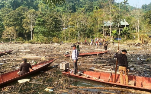 Ông La Văn Thái - Chủ tịch UBND xã Hữu Khuông cho biết, do ảnh hưởng của các đợt mưa lũ giữa năm 2025, lòng hồ Bản Vẽ qua địa bàn xã ngập nhiều rác gỗ, ảnh hưởng đến hoạt động giao thông đường thủy qua địa bàn xã.