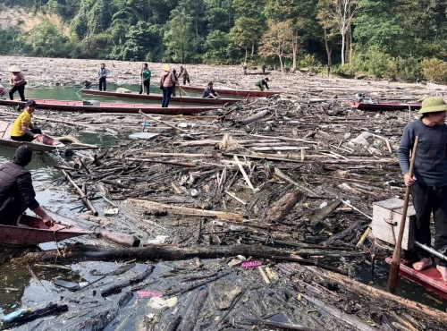 Trước thực trạng gỗ rác phủ kín lòng hồ thủy điện Bản Vẽ, chiều ngày 11/1/2025, 146 cán bộ, người dân và thầy cô giáo xã Hữu Khuông đã tranh thủ ngày Chủ nhật tham gia dọn rác, khơi thông dòng chảy phục vụ việc đi lại, đưa đón con em học sinh đến trường.