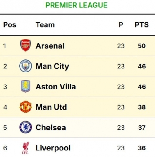 Chiến thắng Man Utd leo lên top 4 bảng xếp hạng, Arsenal vẫn giữ ngôi đầu nhưng ở giai đoạn then chốt họ chỉ còn hơn Man City và Aston Villa 4 điểm sau ở vòng 23 đấu ở Ngoại hạng Anh. Daily Mail |