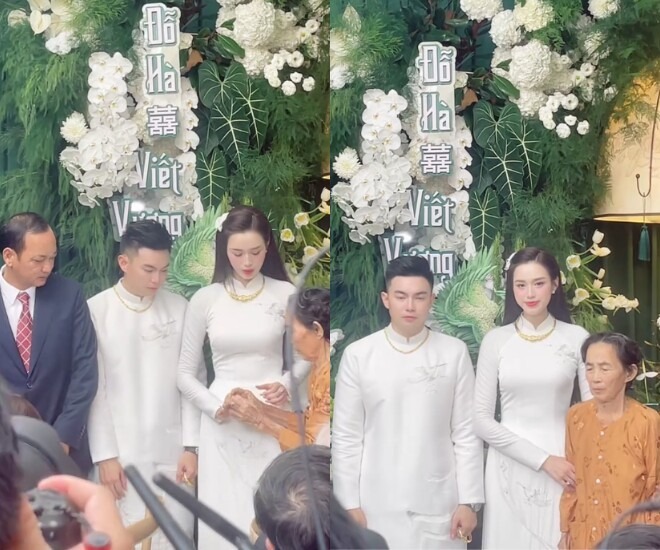 Trong ngày trọng đại, Hoa hậu Đỗ Thị Hà diện áo dài truyền thống trắng. Mỹ nhân sinh năm 2001 trang điểm nhẹ nhàng, để kiểu tóc tự nhiên, tự tin khoe vẻ đẹp thanh lịch, mộc mạc. Thiếu gia Nguyễn Viết Vương cũng mặc áo dài trắng đồng điệu, nắm tay, chăm sóc vợ trong suốt thời gian diễn ra buổi lễ. Nam doanh nhân cùng bố mẹ đã mang sính lễ "khủng", đầy đủ theo phong tục truyền thống để đến hỏi cưới nàng hậu như trầu cau, bánh phu thê, trái cây cùng một số mâm tráp khác.