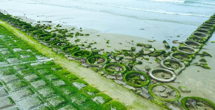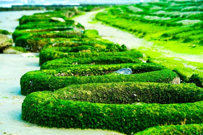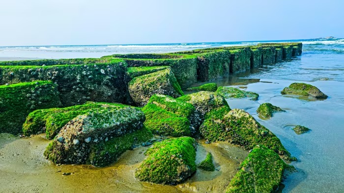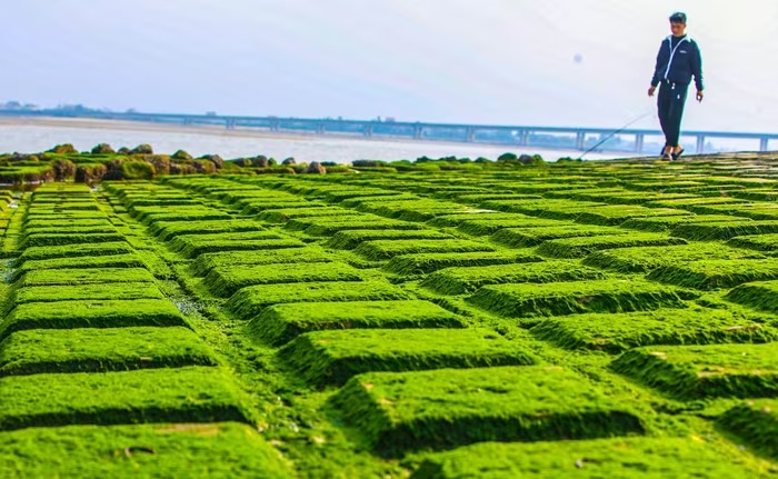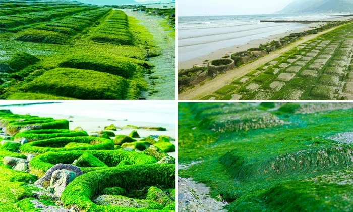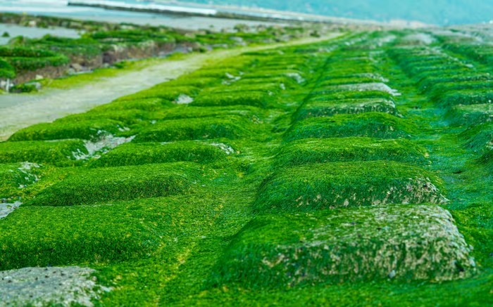Sự xuất hiện đồng đều của rêu không chỉ tạo tương phản về màu sắc mà còn làm thay đổi diện mạo khu vực ven biển, bổ sung thêm yếu tố cảnh quan tự nhiên bên cạnh các công trình hạ tầng hiện hữu.