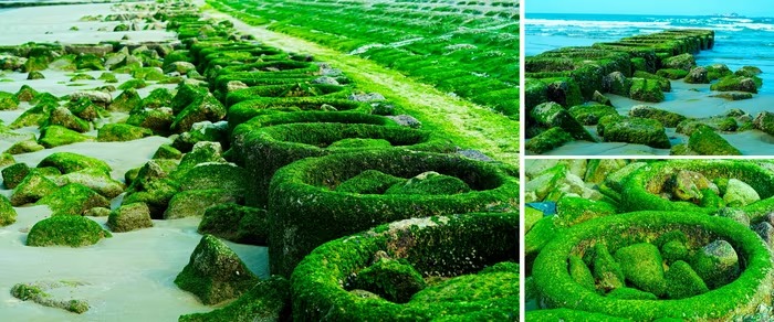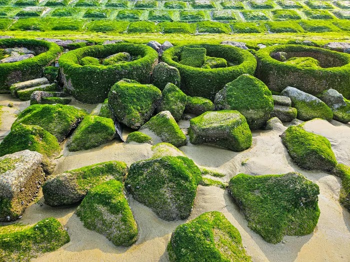 Khi thủy triều rút, rêu lộ ra rất rõ, màu xanh lên hình đẹp. Ảnh: Cẩm Kỳ |