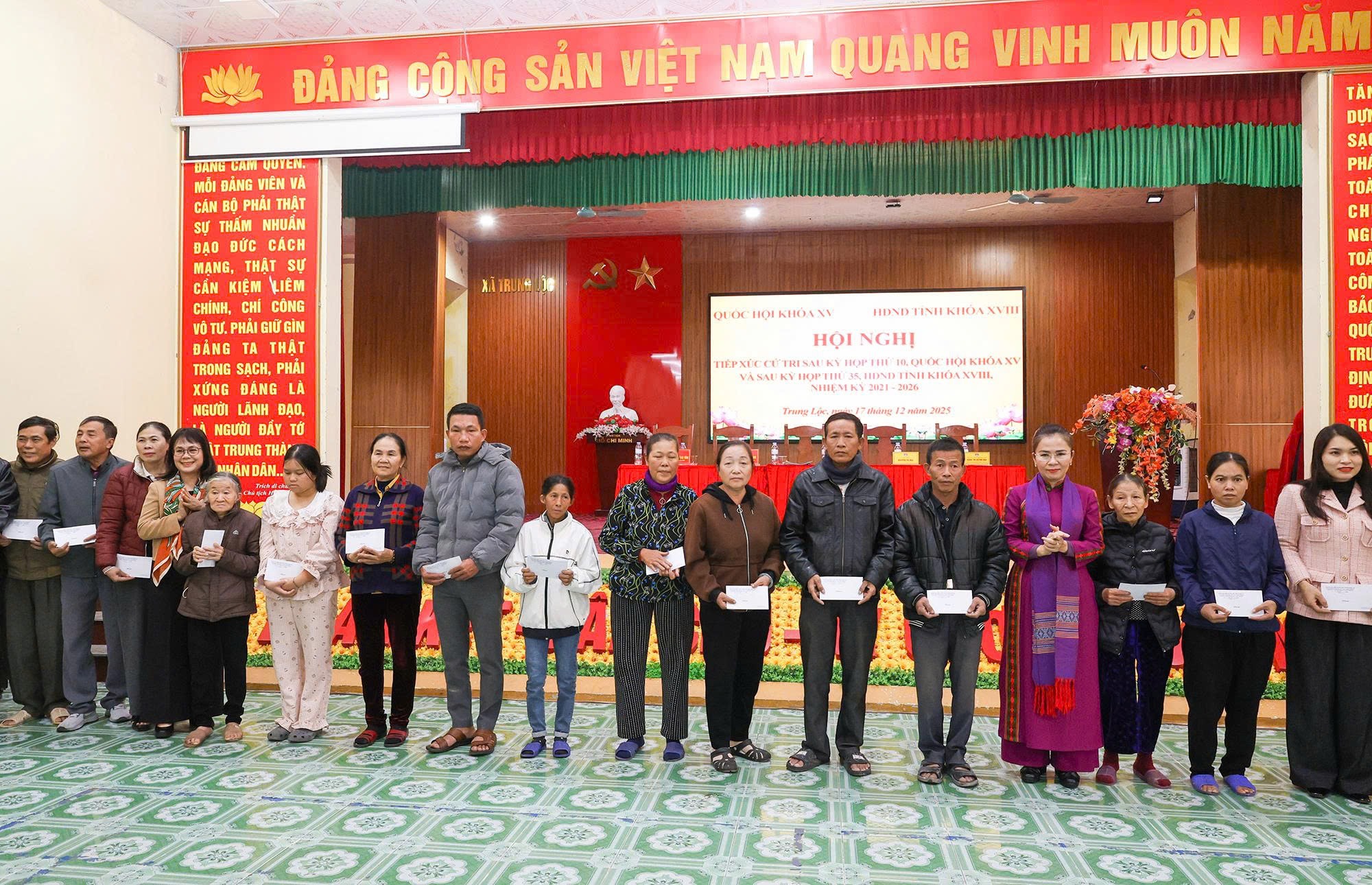 Trước khi diễn ra hội nghị, Phó Chủ nhiệm Ủy ban Kinh tế - Tài chính của Quốc hội Nguyễn Vân Chi và Chủ tịch Ủy ban Mặt trận Tổ quốc tỉnh, Trưởng đoàn ĐBQH tỉnh Võ Thị Minh Sinh đã tặng quà cho 20 hộ nghèo tại xã Trung Lộc |