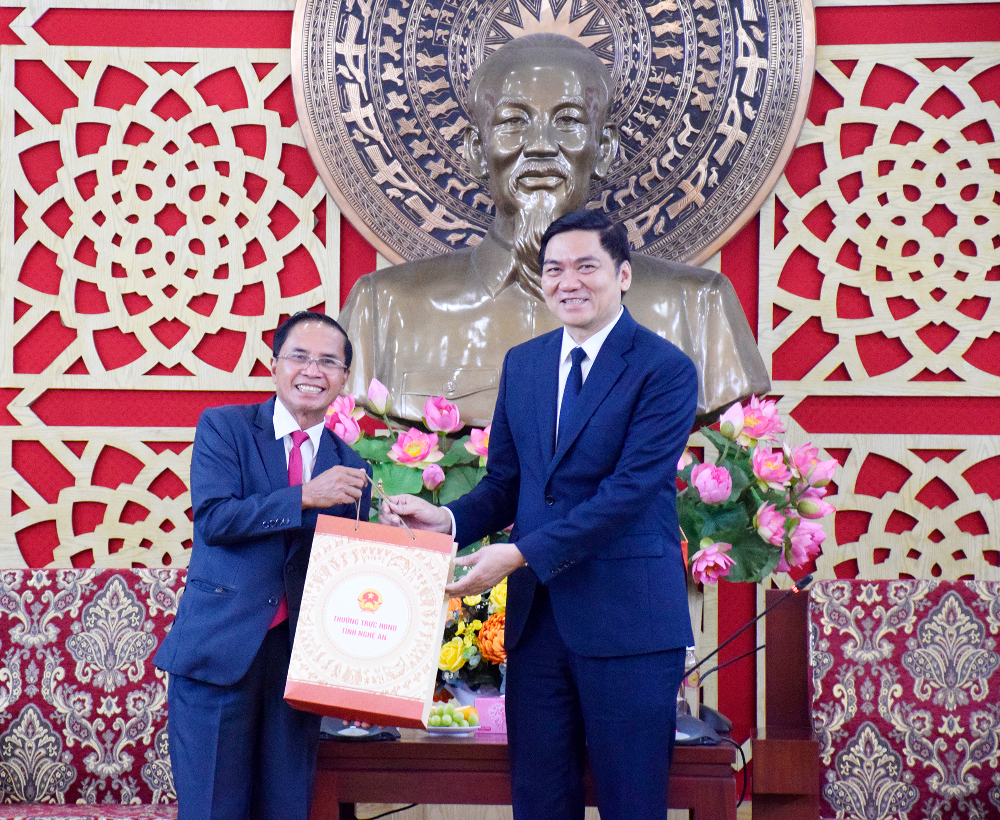 Thay mặt Thường trực HĐND tỉnh, Phó Bí thư Thường trực Tỉnh ủy, Chủ tịch HĐND tỉnh Hoàng Nghĩa Hiếu trân trọng cảm ơn và vui mừng được đón đồng chí Sỉ-Hêng Hóm-Sổm-Băt - Chủ tịch HĐND tỉnh và đoàn đại biểu của HĐND tỉnh Salavan, nước Cộng hòa dân chủ nhân dân Lào sang thăm và chúc mừng thành công cuộc bầu cử đại biểu Quốc hội khóa XVI và đại biểu HĐND các cấp, nhiệm kỳ 2026 - 2031 của tỉnh Nghệ An.