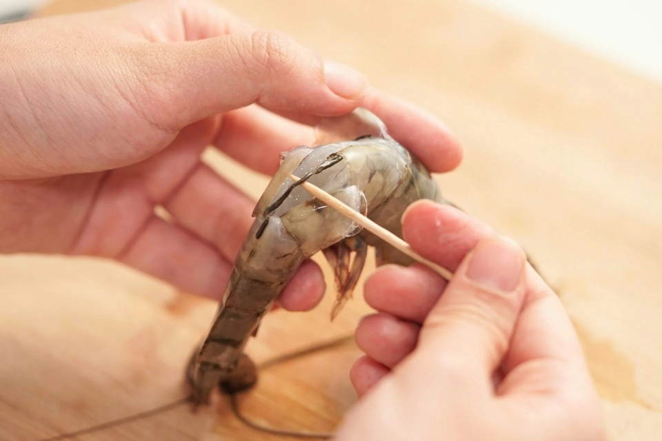 Dùng tăm chọc vào phần giữa đốt thứ 3 và 4 trên lưng tôm, nhẹ nhàng nhấc lên để kéo toàn bộ chỉ lưng ra. Cách này đơn giản, không làm hỏng hình dạng, phù hợp với các món hấp, luộc.