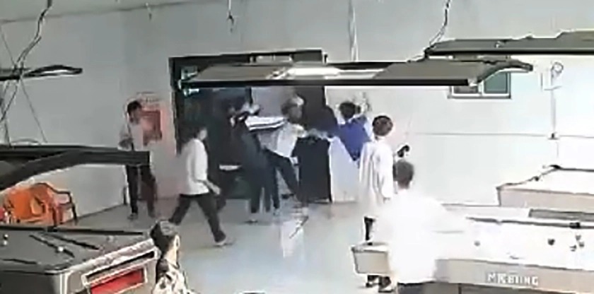 Em học sinh không chỉ bị đấm, đá bằng tay mà còn bị dùng gây chơi bida đánh vào thân thể. Ảnh chụp lại từ camera an ninh tại quán |