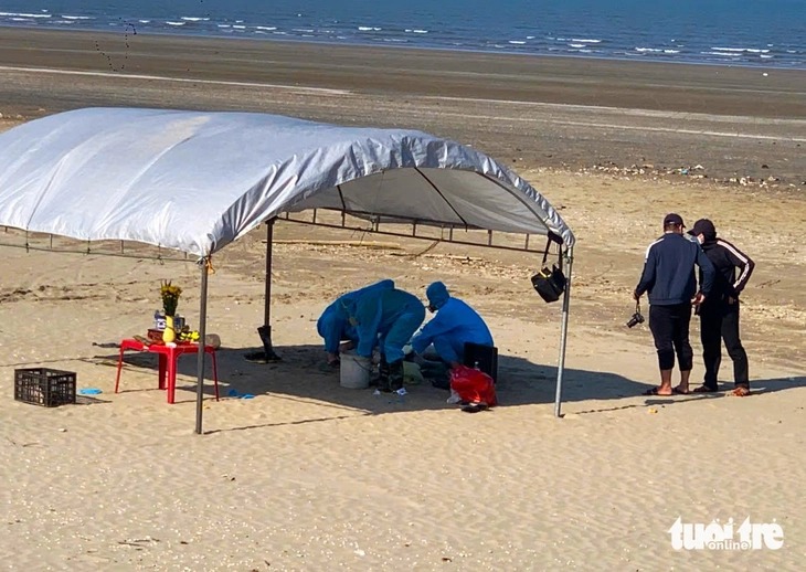 Lực lượng công an đang khám nghiệm tử thi trôi dạt trên vùng biển xã Lộc Hà - Ảnh: LÊ MINH |