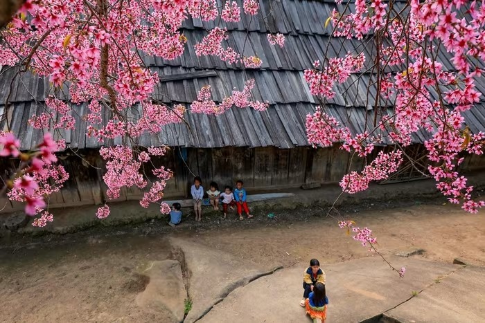 Những hàng cây hoa anh đào được trồng nhiều nhất ở trường tiểu học Mường Típ 1 - điểm trường Phà Nọi và dọc ngay lối vào bản. Hoa anh đào ở đây nở vào khoảng tháng 1 đến tháng 2 dương lịch, với sắc hồng rực rỡ, tạo nên khung cảnh lãng mạn. (Ảnh: Sách Nguyễn). |