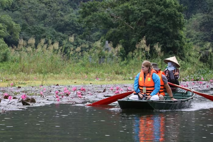 Ngắm sắc hoa súng lung linh nhuộm hồng dòng sông Ngô Đồng là trải nghiệm khó quên đối với du khách trong nước và quốc tế. (Ảnh: Thùy Dung/TTXVN)