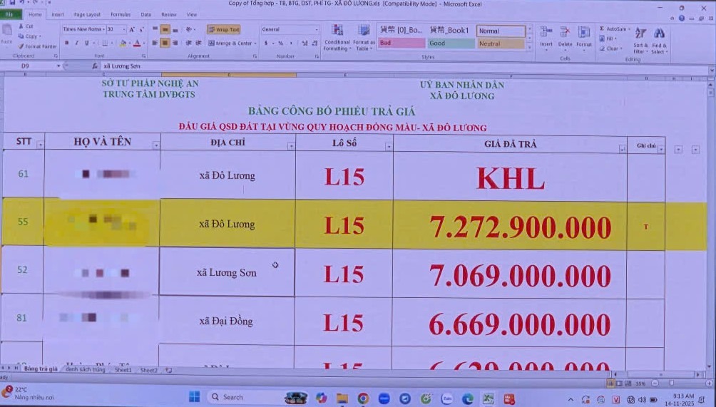 Lô đất có mã L15 được một người dân xã Đô Lương đấu trúng với giá gần 7,3 tỷ đồng |