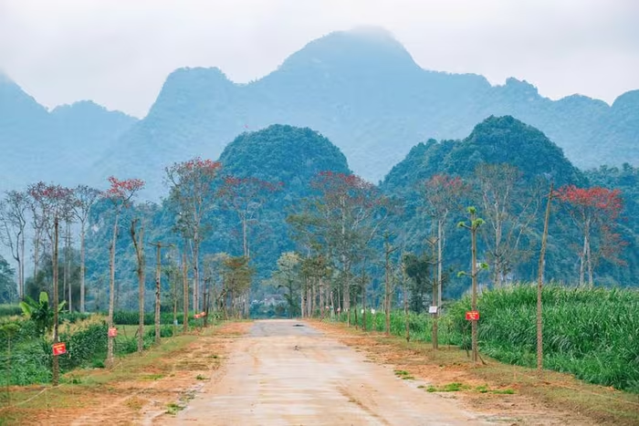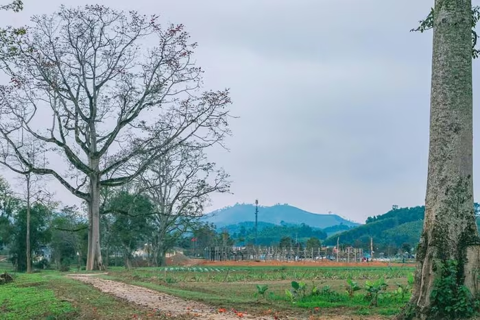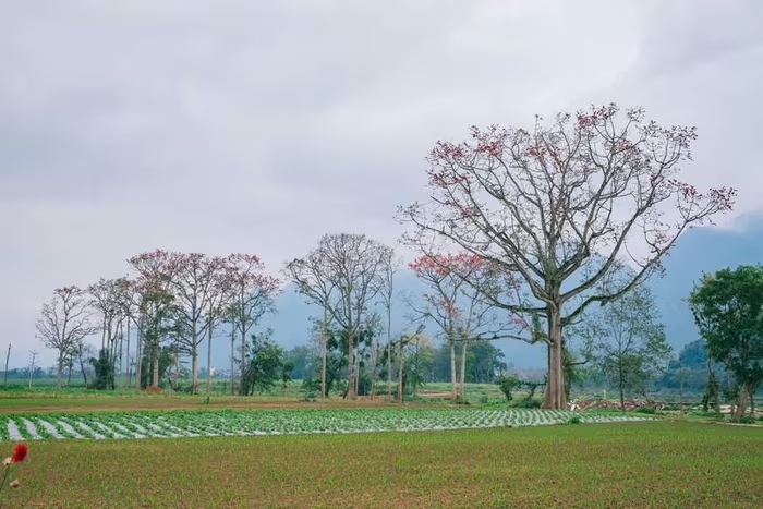 Hoa gạo nở đỏ rực trong sắc xanh của những cánh rừng, làng mạc trù phú tạo điểm nhấn đặc biệt cho vùng đất Nhân Hòa. |