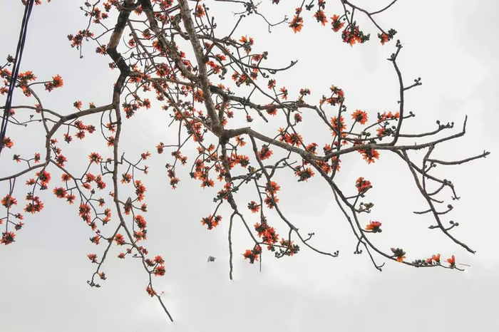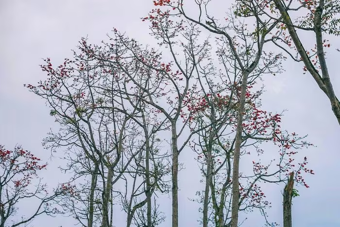 Vào mùa này, cây gạo rụng hết lá, chỉ còn lại những bông hoa trên cành. |