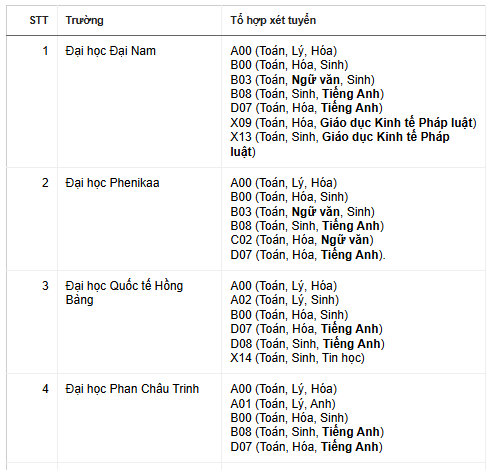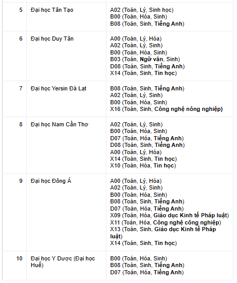 Tổ hợp xét tuyển ngành Y khoa của các trường đại học như sau: