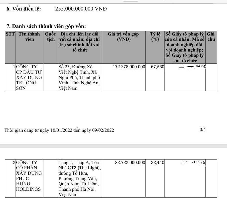 Công ty Cổ phần Đầu tư xây dựng Trường Sơn (có trụ sở cùng với địa chỉ doanh nghiệp dự án An Thịnh Phát tại TP Vinh). Đây là doanh nghiệp hoạt động từ năm 2001 trong các lĩnh vực như xây dựng, kinh doanh bất động sản, quyền sử dụng đất thuộc chủ sở hữu, chủ sử dụng hoặc đi thuê. Chủ tịch HĐQT công ty là ông Nguyễn Xuân Khang (SN 1964).