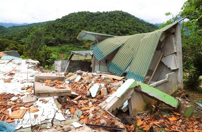 Một căn nhà nằm sát bên bờ suối ở xã Nhôn Mai (tỉnh Nghệ An) bị đổ sập do lũ ống, lũ quét xảy ra vào cuối tháng 7/2025. (Ảnh: Xuân Tiến/TTXVN) |