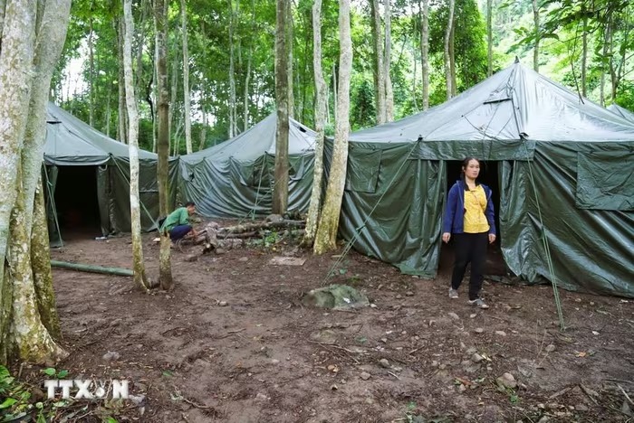 13 hộ dân với hơn 60 nhân khẩu của bản Phá Mựt (xã Nhôn Mai, tỉnh Nghệ An) có nhà bị lũ cuốn trôi hoàn toàn vẫn phải ở tạm trong những ngôi nhà bạt dựng dưới tán rừng săng lẻ. (Ảnh: Xuân Tiến/TTXVN) |