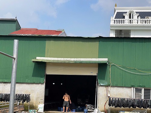 Ngày 24/11 vừa qua, theo quan sát của phóng viên, phía trong xưởng có người đàn ông đang dùng gáo nhựa để múc bột màu trắng lên cân. Ngoài ra, phía trong và ngoài xưởng có một số thùng, lu chứa dung dịch màu trắng.