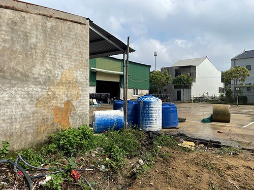 Thùng bám dung dịch màu trắng được để phía ngoài xưởng sản xuất giá đỗ. Ảnh chụp tháng 10/2025 |