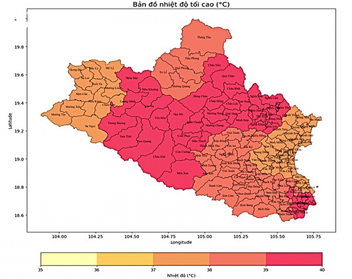 Theo dự báo, từ ngày 8–9/4, nắng nóng tiếp tục duy trì và có xu hướng gia tăng cường độ. Nhiệt độ cao nhất trong ngày phổ biến 37–40 độ C, nhiều nơi có thể vượt 40 độ C, tập trung tại các khu vực như Tương Dương, Quỳ Châu, Quỳ Hợp, Nghĩa Đàn, Tây Hiếu, Đô Lương, TP Vinh… Độ ẩm thấp nhất dao động từ 30–45%, thời gian nắng nóng kéo dài từ khoảng 10h đến 17h mỗi ngày.