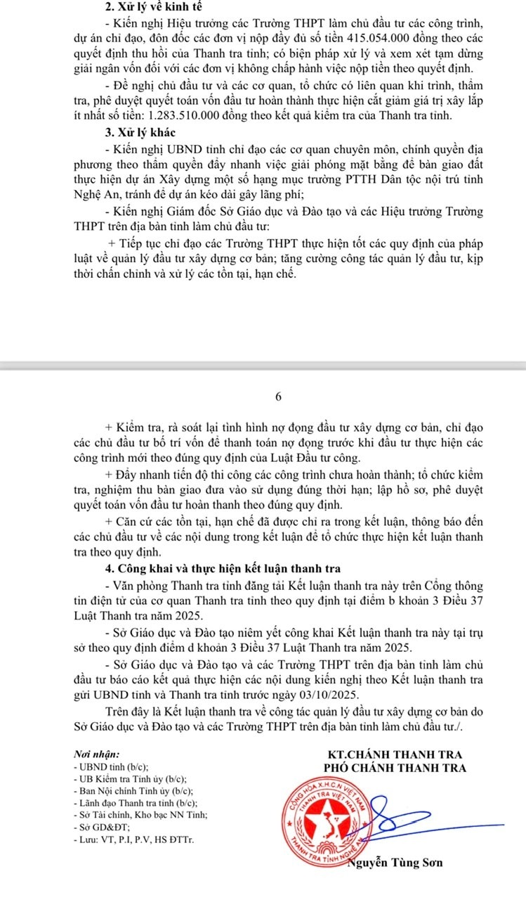 Kiến nghị Hiệu trưởng các Trường THPT làm chủ đầu tư các công trình, dự án chỉ đạo, đôn đốc các đơn vị nộp đầy đủ số tiền hơn 415 triệu đồng theo các quyết định thu hồi của Thanh tra tỉnh; có biện pháp xử lý và xem xét tạm dừng giải ngân vốn đối với các đơn vị không chấp hành việc nộp tiền theo quyết định.