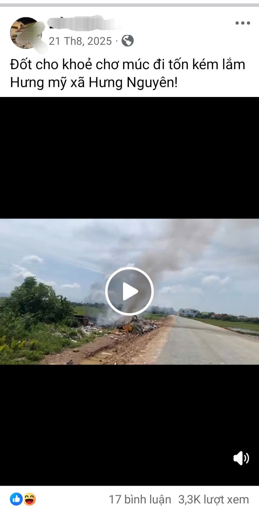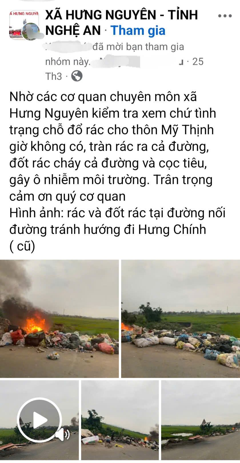 "Nhờ các cơ quan chuyên môn xã Hưng Nguyên kiểm tra xem chứ tình trạng chỗ đổ rác cho thôn Mỹ Thịnh giờ không có, tràn rác ra cả đường, đốt rác cháy cả đường và cọc tiêu, gây ô nhiễm môi trường", một người dân chia sẻ dòng trạng thái bức xúc trên mạng xã hội Facebook ngày 25/3.