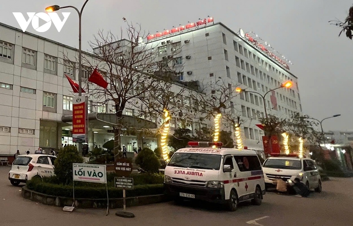 Xe cứu thương đỗ trong khuôn viên bệnh viện Hữu nghị đa khoa Nghệ An. (Ảnh: Hải Chi). |