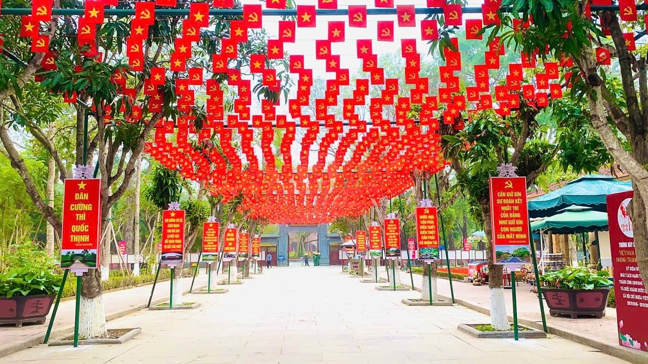 Khu di tích Kim Liên trang trí băng rôn, cờ hoa chào mừng Đại hội Đảng XIV. |