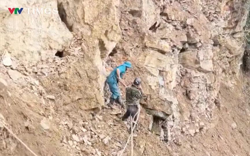 | Sau đó, lực lượng chức năng phải leo lên các vách núi cạy phá những tảng đá treo lơ lửng để thông đường. Ảnh: Phan Ngọc. |