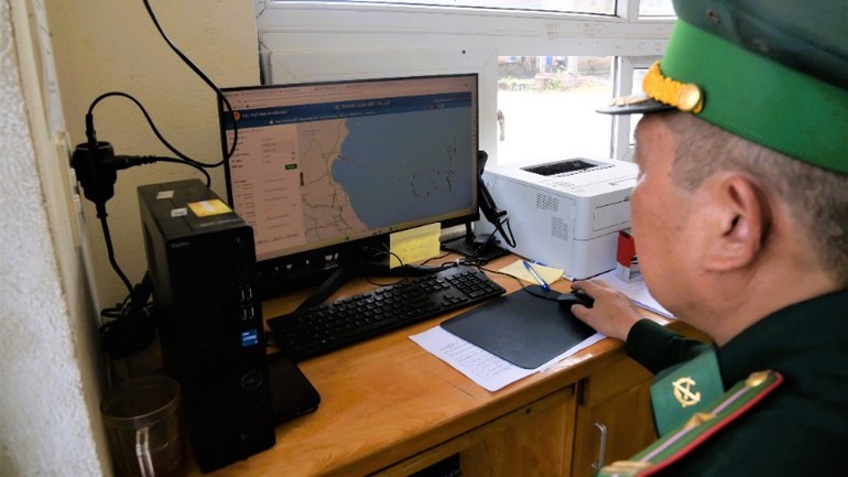 Cán bộ Trạm Kiểm soát Biên phòng Lạch Quèn, Đồn Biên phòng Quỳnh Thuận, Ban Chỉ huy Bộ đội Biên phòng tỉnh Nghệ An kiểm tra giám sát phương tiện xuất, nhập lạch bằng phần mềm quản lý tàu cá. |