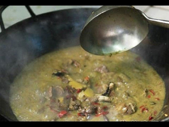 Quy trình chế biến bắt đầu bằng phi thơm tỏi, gừng, hành lá và ớt Quý Châu. Thịt bò cùng nội tạng được xào sơ trước khi đổ hỗn hợp dịch cỏ và mật bò vào đun sôi. Nước dùng của món lẩu có màu xanh ô liu đậm.