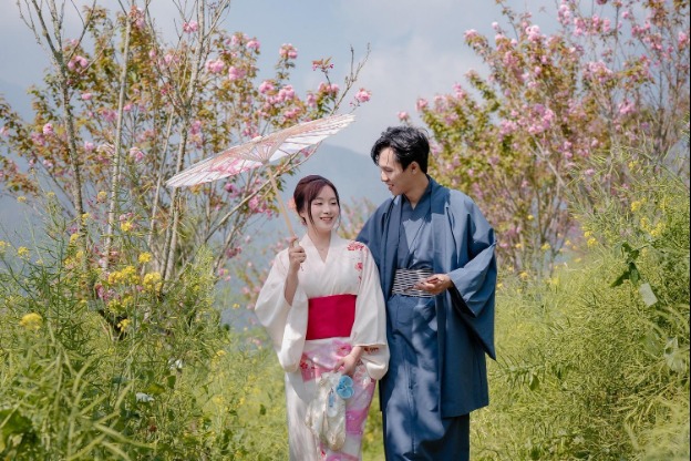 Điểm dừng chân thơ mộng nhất chính là Ga Mường Hoa và lối vào vườn hồng lớn, nơi kiến trúc châu Âu cổ điển quyện vào sắc hồng Á Đông lãng mạn như một thước phim điện ảnh. Những chùm hoa anh đào kép tại đây dường như cũng rực rỡ hơn khi được đặt cạnh những mảng tường mang đậm lối kiến trúc cổ kính.