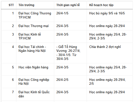Cụ thể, một số trường như trường Đại học Thương mại, Học viện Ngân hàng, Đại học Kinh tế TP.HCM… tổ chức học online vào ngày 28-29/4 để sinh viên không phải đến trường 9 ngày liên tục, từ ngày 26/4 đến hết ngày 3/5.