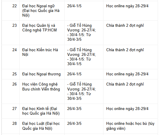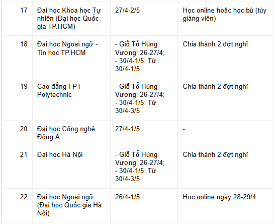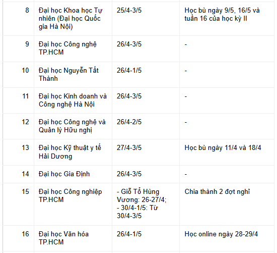 Trong khi đó, một số trường sắp xếp lịch học bù trước hoặc sau kỳ nghỉ lễ, như trường Đại học Kỹ thuật y tế Hải Dương, trường Đại học Công Thương TP.HCM, trường Đại học Khoa học Tự nhiên (Đại học Quốc gia Hà Nội)...