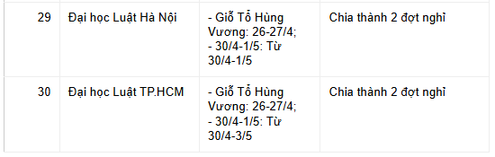 Ngược lại, vẫn có những cơ sở đào tạo giữ lịch học xen kẽ, cho sinh viên nghỉ hai đợt và học bình thường trong các ngày 28-29/4 như trường Đại học Công nghệ Đông Á, trường Đại học Hà Nội, trường Đại học Công nghiệp TP.HCM…