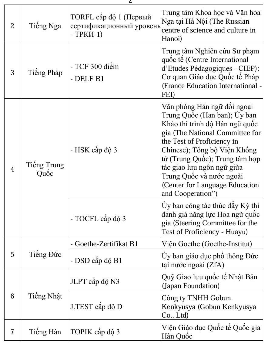Danh mục chứng chỉ ngoại ngữ quy định của bộ như sau: