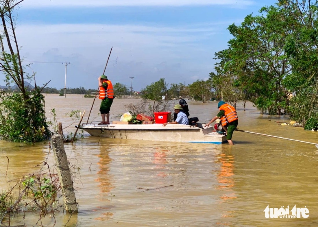 Lực lượng Công an xã Đức Quang dùng ca nô tiếp tế lương thực cho người dân vùng lũ - Ảnh: LÊ MINH