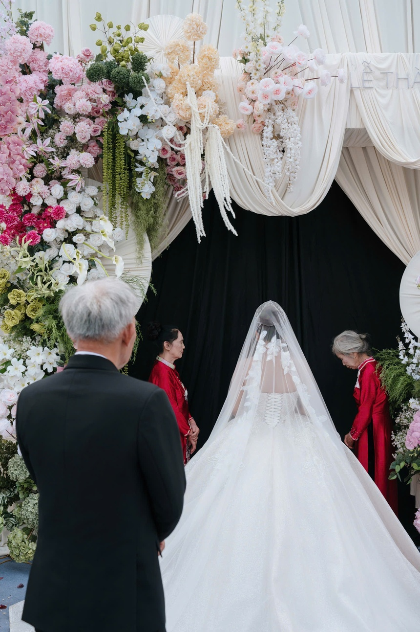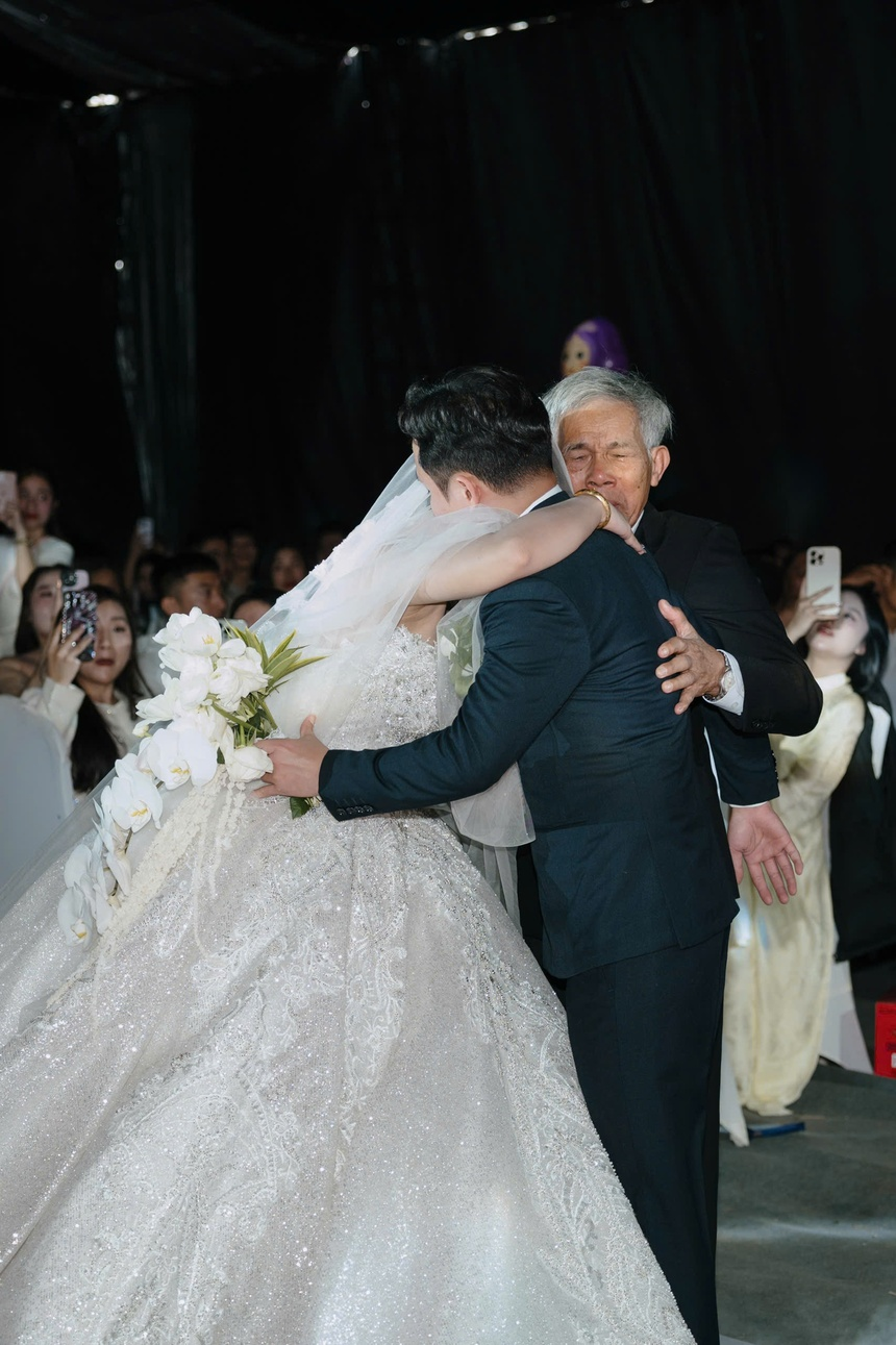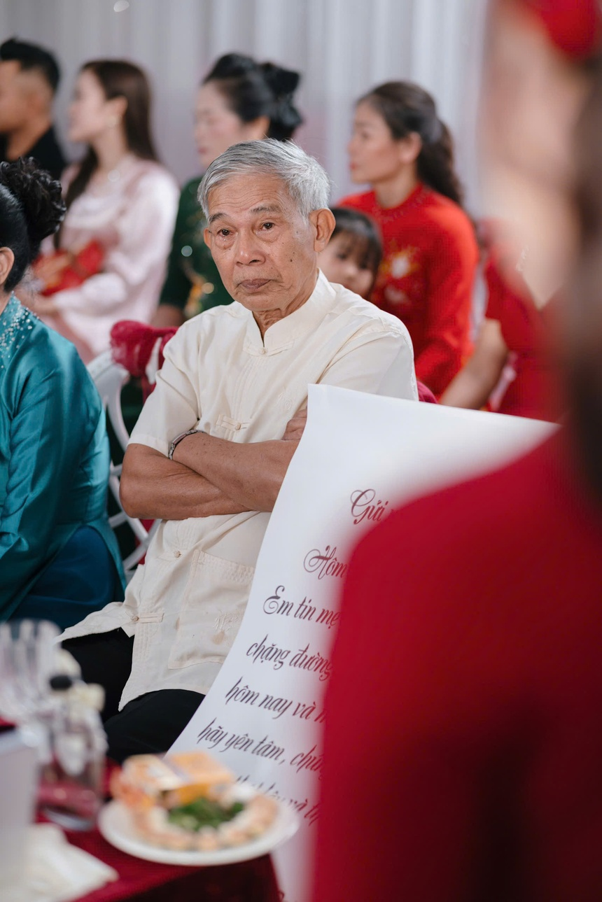 Không kìm được cảm xúc, ông bà nội của Kim Ngân nhiều lần bật khóc khi chứng kiến khoảnh khắc cháu gái nhỏ đã trưởng thành, có gia đình mới. Ông cũng dặn dò chú rể: "Ông mong con sẽ yêu thương, trân trọng cháu của ông bà. Đây là cục vàng của ông bà đã chăm bẵm bao nhiêu năm qua".