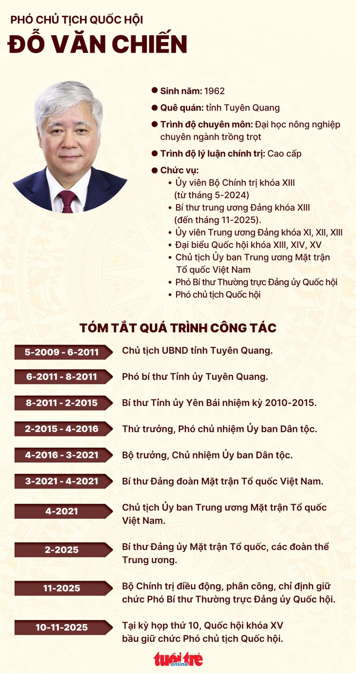 Ông Đỗ Văn Chiến, sinh năm 1962, quê Tuyên Quang. Ông có trình độ chuyên môn Đại học Nông nghiệp chuyên ngành trồng trọt. Trình độ lý luận chính trị cao cấp. Ông là Ủy viên Bộ Chính trị khóa XIII (từ tháng 5-2024); Bí thư Trung ương Đảng khóa XIII (đến tháng 11-2025); Ủy viên Trung ương Đảng khóa X (dự khuyết), XI, XII, XIII; đại biểu Quốc hội khóa XIII, XIV, XV. Ông có thời gian dài công tác tại tỉnh Tuyên Quang, sau đó, làm Thứ trưởng - Phó chủ nhiệm Ủy ban Dân tộc, Bộ trưởng - Chủ nhiệm Ủy ban Dân tộc, Chủ tịch Ủy ban Trung ương Mặt trận Tổ quốc Việt Nam. Ngày 4-11-2025, ông được Bộ Chính trị điều động, phân công, chỉ định tham gia Ban Chấp hành, Ban Thường vụ Đảng ủy và giữ chức Phó bí thư Thường trực Đảng ủy Quốc hội. |