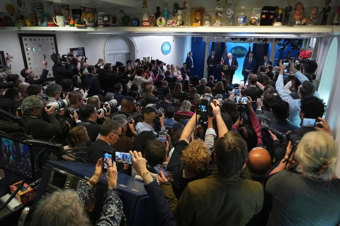 Khung cảnh cuộc họp báo của Tổng thống Donald Trump tại Nhà Trắng hôm 6-4. Ảnh: AP